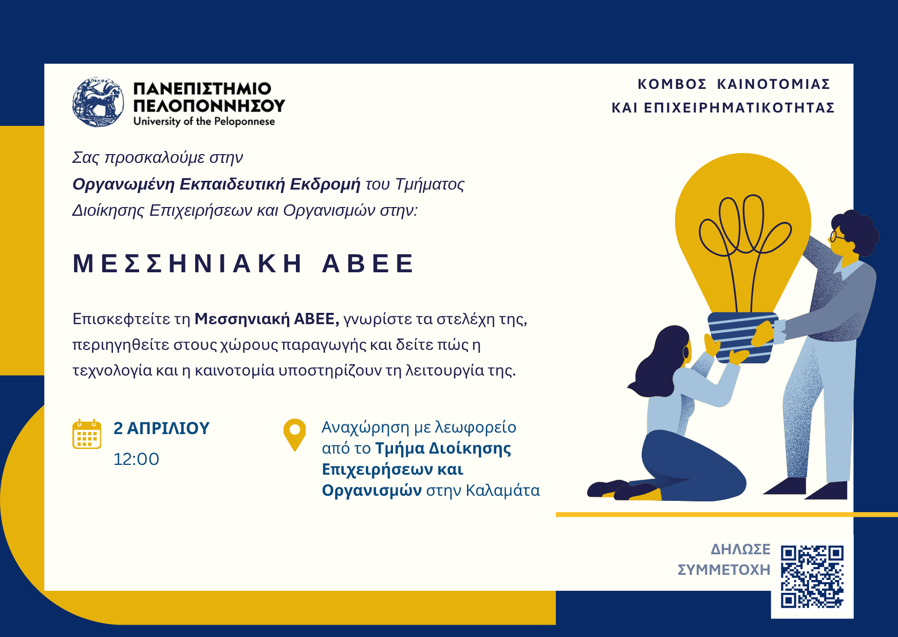 Το Πανεπιστήμιο Πελοποννήσου καλεί τους φοιτητές του Τμήματος Διοίκησης Επιχειρήσεων και Οργανισμών στη Καλαμάτα στην εκπαιδευτική εκδρομή που πρόκειται να διεξαχθεί στη Μεσσηνιακή Α.Β.Ε.Ε την Πέμπτη 2 Απριλίου.